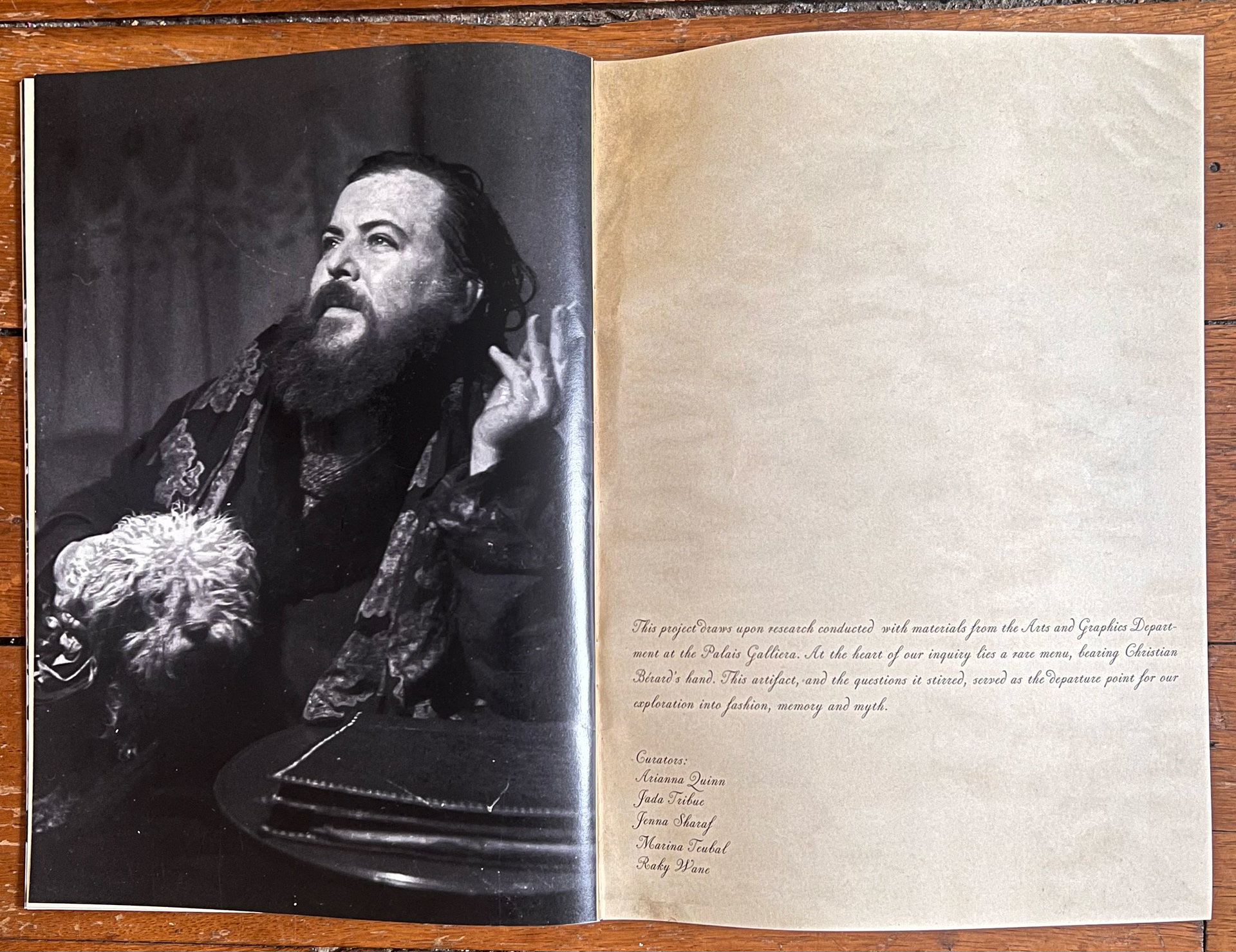 Our exhibition offers a fictionalized reenactment of that evening, intertwining fact and fable. A table invites you to take a seat in his world. Images and documents dress it, while a menu of imagined testimonies, written in the voices of friends, observers, journalists, narrate the night. These literary gestures bridge archival material and imagination, exploring Bérard’s biography, and the unity of fashion, performance, and storytelling. Visitors are invited to take a menu home, carry Bérard’s story into their own space. Literature becomes a curatorial strategy, animating the archive and questioning how history is constructed.